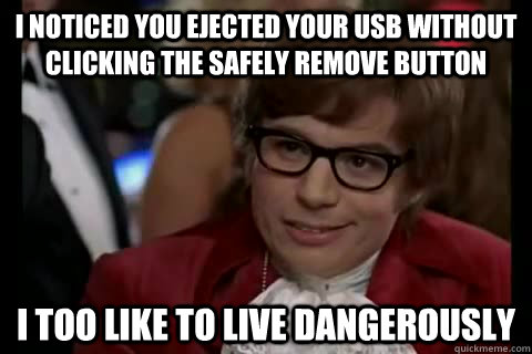 Misalnya, file atau data yang sudah dipindah ke FD sudah 99%. Dan seketika Anda mencabut kemungkinan besar data rusak total. Selain sistem write-cache yang terputus, arus pendek aliran listrik pada FD juga merusak data atau file itu sendiri. Walau kemungkinannya kecil, namun Anda harus tetap men-safely remove hardware.